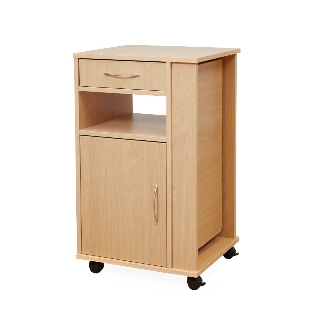 • Skapītis ar 4 gumijas ritenīšiem, kas nesmērē grīdu. 2 ritenīši ir ar bremzēm. Nerada troksni.